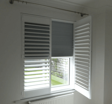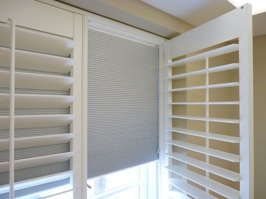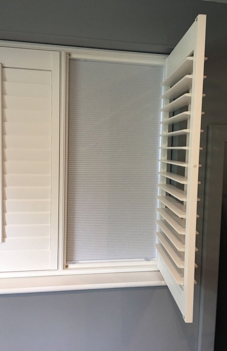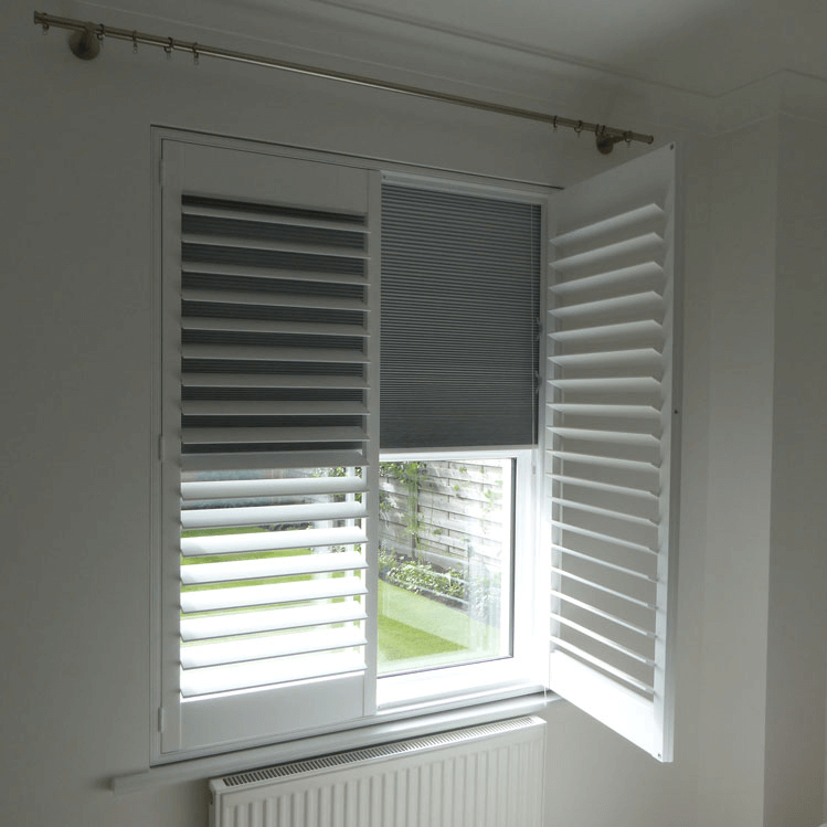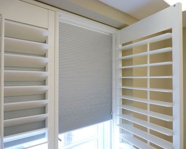 These shutters are a mix of a blind system and louvered shutters, allowing you to completely black out the space, thanks to the special frame that allows an integrated blackout honeycomb blind to fit inside the shutter frame, providing the perfect combination of style and functionality.
